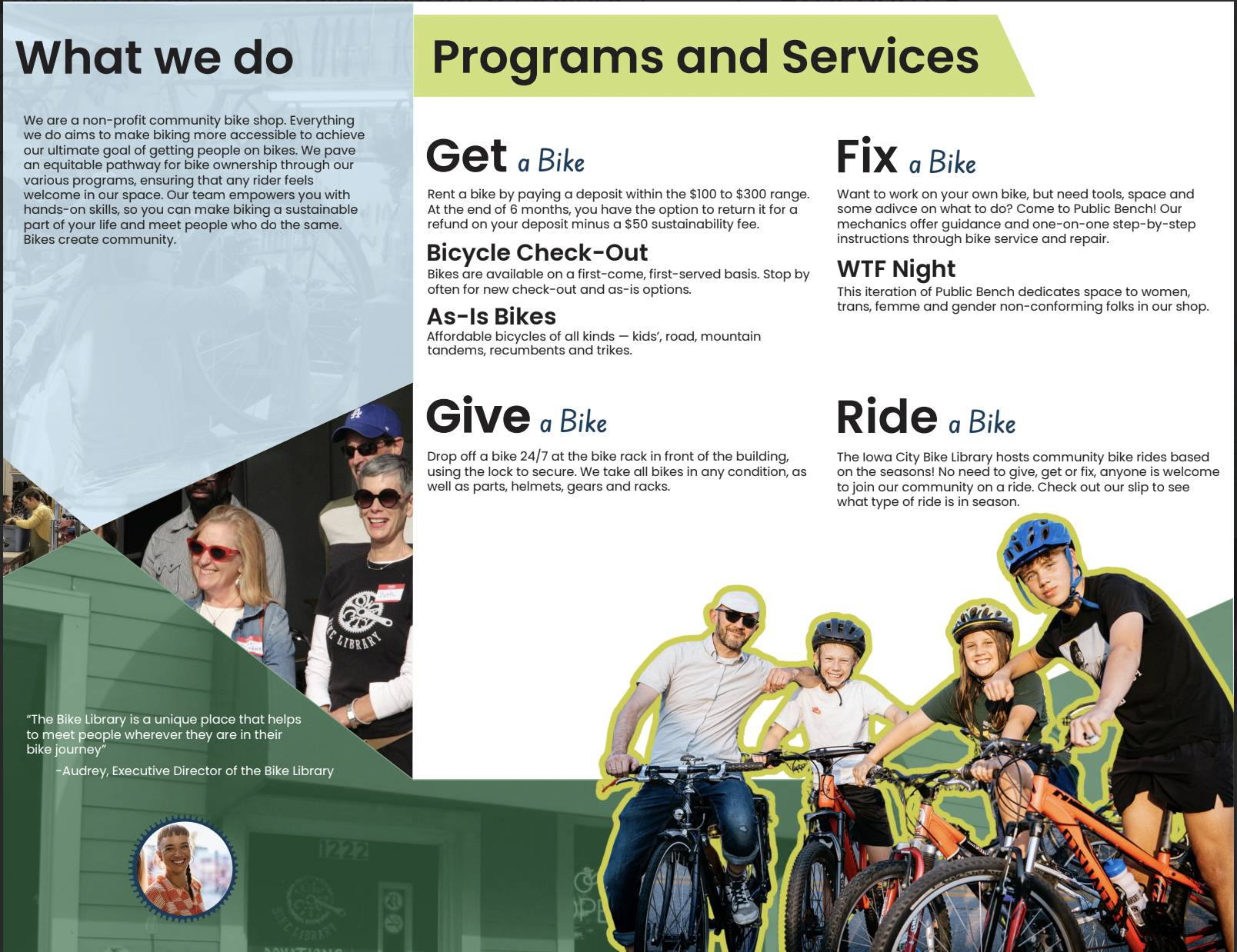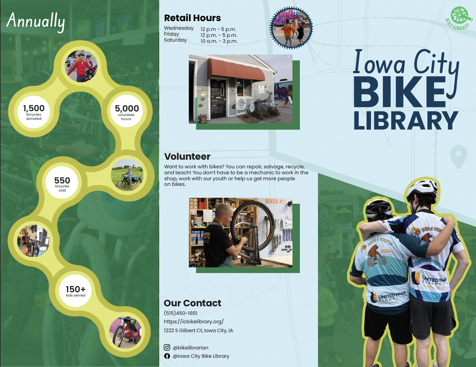 The Iowa City Bike Library is a collective hub that meets people wherever they are in their bike journey. Providing people with ways to fix, ride, get, and give bikes to keep biking accessible and fun.